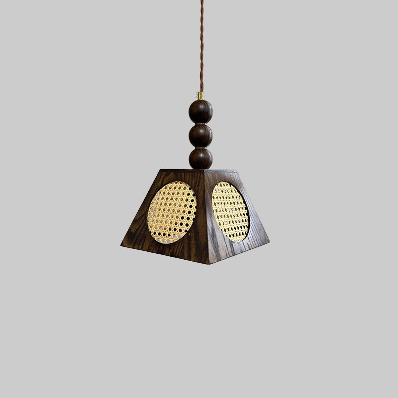 Handwoven rattan shade with solid wood trim for warm, natural diffusion