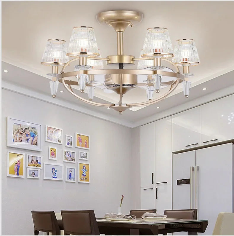 Loved for combining luxury crystal chandelier aesthetics with the practicality of fan cooling and remote dimming—all in one unified, modern fixture.